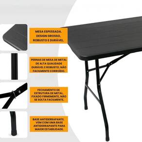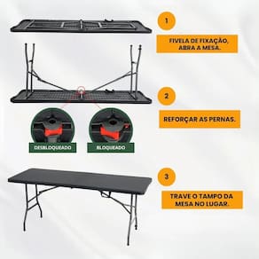 A Mesa Dobrável Evolux 180cm Preta é a solução definitiva para quem busca uma mesa espaçosa, versátil e fácil de transportar. Com um tampo amplo de 1,80 metro, ela oferece o dobro de espaço em comparação com mesas menores, sendo perfeita para acomodar confortavelmente até 8 pessoas. Sua estrutura robusta em aço e o tampo em polietileno de alta densidade (HDPE) garantem alta resistência e durabilidade. O design inteligente, com um sistema de pés dobráveis e uma alça de transporte, permite que a mesa se transforme em uma maleta, facilitando o transporte e o armazenamento em qualquer lugar. É a escolha ideal para eventos, festas, churrascos, feiras ou para uso diário em casa, no jardim ou em acampamentos.