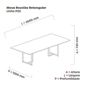 Mesa de Reunião com tampo de 25mm de espessura tipo retangular com medida de 260x90cm. A Mesa para Escritório consegue combinar facilmente com outras mobílias sem atrapalhar a decoração. Ela oferece espaço para você e deixa o seu local de trabalho muito mais organizado e elegante. É ideal para desempenhar tarefas diárias de trabalho, acomoda inúmeros objetos que você desejar produzida em estrutura MDP que a deixa mais resistente e mais segura para você. Acabamento: Melamínico Ambiente Principal: Escritório Complexidade da Montagem: Baixa: pode ser montado por uma pessoa sozinha Cor: Noce Naturalle/Preto Cor do Produto: Noce Naturalle/Preto Escala de Brilho: Semi-Fosco Espessura do Tampo: 25 mm Itens Inclusos: 1 Mesa, Kit Ferragens Linha ou Coleção: P25 Manual de Montagem e Instalação: https://product-hub-prd.madeiramadeira.com.br/890994/documents/d0eba604-7a25-4a8f-b543-f028aa62948eMesa20ReuniC3A3o20P2520TUB.pdf Material Principal: MDP Necessita Montagem: Sim Origem do Produto: Nacional Peso: 59,942 kg Possui Passa Cabos: Não Possui Prateleiras: Não Quantidade de Lugares: 8 Recomendações de Uso, Manutenção e Limpeza: Limpeza Deve ser Feita com um Pano Levemente Umedecido e um Pano Seco. Sapatas Niveladoras: Sim Sistema de Montagem: parafuso Suporta Até (kg): 30 kg