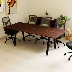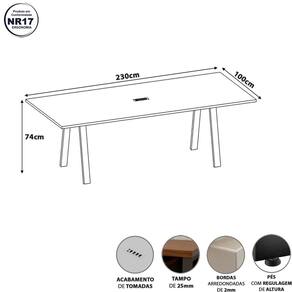 Mesa de reunião com espaço para até 8 pessoas, com estrutura firme e caixa de tomadas para conexão rápida de equipamentos. Solução inteligente e pronta para uso em ambientes corporativos modernos, como salas de reunião ou coworkings.