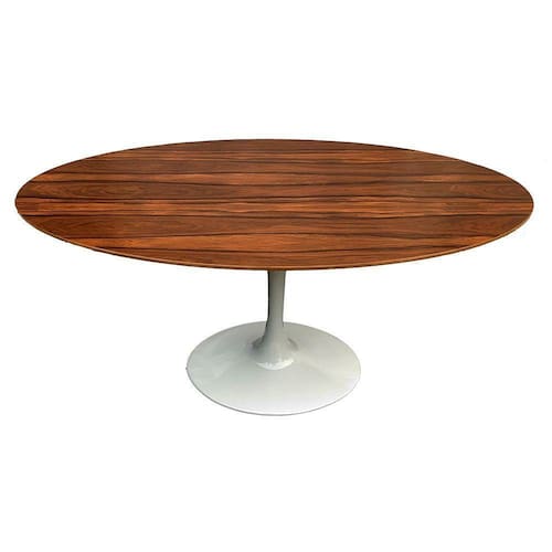 A Mesa Saarinen Oval Pau Ferro 235x122cm - Base Branca foi criada em 1957 por Eero Saarinen, a Mesa Tulip Saarinen resolveu o mundo feio, confuso e incomum embaixo de mesas. A Tulipa, é uma realização definidora de design moderno e uma adição intemporal para sua casa - um verdadeiro clássico.