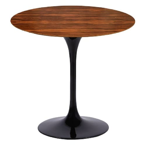 Esta versão da Mesa Saarinen se destaca pelo seu tampo redondo de 150cm de diâmetro, habilmente trabalhado em madeira pau ferro. Este material nobre, com suas nuances e veios marcantes, confere um toque de calor e autenticidade. A base, por sua vez, é cuidadosamente produzida em alumínio fundido com pintura automotiva pu na cor preta, proporcionando não apenas robustez e estabilidade, mas também um contraste dramático e contemporâneo com a beleza natural do pau ferro.