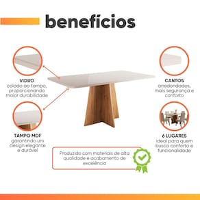 A Mesa Anjos 1,60m é a escolha perfeita para quem valoriza elegância, conforto e funcionalidade em um único produto. Com design moderno, ela se adapta facilmente a diferentes estilos de ambiente, valorizando salas de jantar e espaços integrados. Seu tampo em MDF com vidro colado e pintura UV garante maior durabilidade, brilho e proteção, além de facilitar a limpeza no dia a dia. A base oferece excelente estabilidade e resistência, enquanto seu acabamento proporciona um toque suave e aconchegante, elevando o nível de conforto e sofisticação do ambiente. Funcional e elegante, a Mesa Anjos 1,60m une qualidade e beleza para tornar seus momentos ainda mais especiais.
