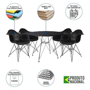 Mesa Sala De Jantar Eames Eiffel Redonda 90cm Preta Com 4 Poltronas Pretas Ferro PretoO Conjunto de Mesa Eames Eiffel e Poltrona Daw se destaca pelo design moderno e sofisticado. Com base em ferro que confere total resistência, garantindo melhor durabilidade, sendo uma ótima escolha para quem busca conforto e design único.Tipo: ConjuntoModelo: DawCor do Tampo: PretoCor do Assento: PretoCARACTERÍSTICASAssento: PolipropilenoTampo: PretoBase: FerroGarantia: 90 DiasDIMENSÕES DA POLTRONAAltura: 80cmAssento até o chão: 40cmBraço do assento até o chão: 65cmLargura: 38cmComprimento: 38cmSuporta até: 120kgDIMENSÕES DA MESAAltura: 76cmDiâmetro: 90cmRECOMENDAÇÕESLimpeza: Utilize um pano macio levemente úmido.Necessita montagem.ATENÇÃOAS IMAGENS SÃO MERAMENTE ILUSTRATIVAS E PODEM SOFRER VARIAÇÕES DE COR E PEQUENOS DETALHES DE ACORDO COM O SEU MONITOR, ILUMINAÇÃO DO AMBIENTE E ATÉ MESMO A SUA PERCEPÇÃO VISUAL.