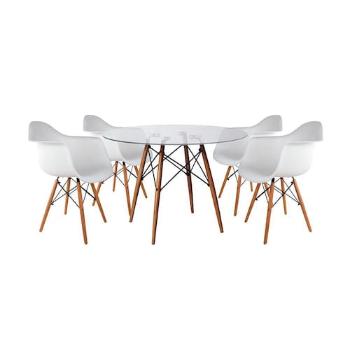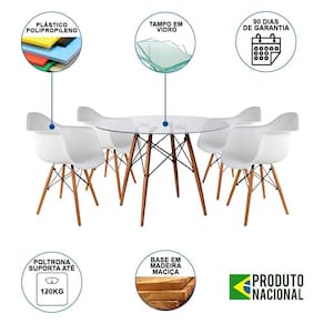 Mesa Sala De Jantar Eiffel Eames Redonda Vidro 90cm Com 4 Poltronas Brancas Base Madeira MaciçaO Conjunto de Mesa Eames Eiffel e Poltrona Daw se destaca pelo design moderno e sofisticado. Com base em madeira maciça que confere total resistência, garantindo melhor durabilidade, sendo uma ótima escolha para quem busca conforto e design único.Tipo: ConjuntoModelo: DawCor do Tampo: VidroCor do Assento: BrancoCARACTERÍSTICASAssento: PolipropilenoTampo: VidroBase: Madeira MaciçaGarantia: 90 DiasDIMENSÕES DA POLTRONAAltura: 80cmAssento até o chão: 40cmBraço do assento até o chão: 65cmLargura: 38cmComprimento: 38cmSuporta até: 120kgDIMENSÕES DA MESAAltura: 76cmDiâmetro: 90cmRECOMENDAÇÕESLimpeza: Utilize um pano macio levemente úmido.Necessita montagem.ATENÇÃOAS IMAGENS SÃO MERAMENTE ILUSTRATIVAS E PODEM SOFRER VARIAÇÕES DE COR E PEQUENOS DETALHES DE ACORDO COM O SEU MONITOR, ILUMINAÇÃO DO AMBIENTE E ATÉ MESMO A SUA PERCEPÇÃO VISUAL.