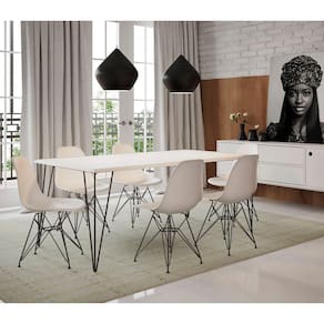 Mesa sala de jantar industrial clips branca 135x75 com 6 cadeiras eiffel brancas de ferro pretoO jogo de mesa 6 cadeiras eames clips se destaca pelo design moderno e sofisticado. A cadeira eames eiffel é confeccionada em polipropileno, sua base é em ferro, o que confere total resistência e conforto. O jogo de mesa 6 cadeiras eames clips da vida ao ambiente além de combinar com todos os tipos e cores de móveis.Caracteristicas cadeiraTipo: cadeiraModelo: eiffelCor: brancoBase: ferro na cor preta Dimensões do produtoAltura: 85 cm largura: 47 cm profundidade: 50 cm assento x chão: 45 cm contém: 06 cadeirasCaracteristicas mesaTipo: mesaModelo: clipsCor: pretoBase: ferro na cor preta Dimensões do produtoAltura: 75cmLargura: 135cmProfundidade: 75cm Obs: imagens meramente ilustrativa
