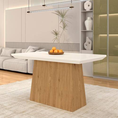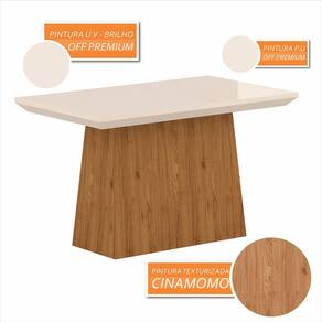 - Material da Base: MDP 15mm - Material do Tampo: MDP/MDF 15mm - Acabamento: Pintura UV Texturizada/UV Brilho - Tonalidade da Mesa: Cinamomo/Off - NÃO possui tampo de vidro - NÃO possui cadeiras