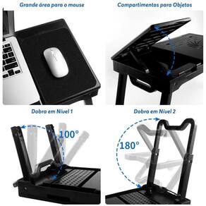Ajuste de Inclinação Inteligente: Possui níveis ajustáveis de inclinação até 180 para posicionar o notebook no ângulo ideal, reduzindo dores nas costas e pescoço durante longos períodos de uso.
