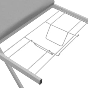 Especificações Técnicas: - Material da tábua: Aço - Material da estrutura: Aço - Cor: tecido cinza metalizado e estrutura branca - Tratamento antiferrugem