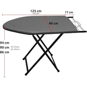 Praticidade pensada nos detalhes: suporte integrado para o ferro, montagem simples e dimensões de embalagem práticas para transporte e armazenamento. Perfeita para uso doméstico e para quem precisa de uma tábua robusta e com área de trabalho ampla.