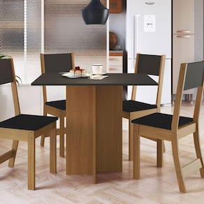 Mesa Talita Com 4 Cadeiras Freijo/ Com Assento Preto - Indekes O Conjunto de Mesa de Jantar Talita reúne praticidade e elegância em um único produto, sendo composto por uma mesa e quatro cadeiras. Seu design moderno e compacto é perfeito para ambientes menores, proporcionando conforto e estilo em todas as suas refeições. Ideal para momentos em família ou encontros com amigos!Dimensões do conjunto montado:Altura: 77 cmLargura: 91,8 cmProfundidade: 68 cmObservações:- Estrutura robusta em MDP e MDF, garantindo resistência e durabilidade por muito mais tempo.- Cadeiras com assentos acolchoados em espuma de poliuretano.- Revestimento dos assentos em tecido.- Design elegante e contemporâneo, com acabamento que valoriza qualquer espaço.- Ideal para cozinhas ou salas de jantar menores, aproveitando cada centímetro com charme e funcionalidade.