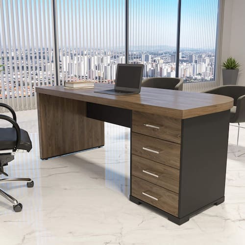 Um escritório moderno precisa de móveis à altura, e a Mesa Tamburato com Gavetas é ideal para fazer do ambiente corporativo um local agradável e sofisticado! Ela é perfeita para aumentar o bem estar e a produtividade dos colaboradores, já que possui um tamanho adequado para maior conforto e uma ampla superfície de trabalho. Além disso, esta mesa conta com um gaveteiro com 4 gavetas que podem ser trancadas, para que seu trabalho fique ainda mais organizado e seguro. Corrediças telescópicas e puxadores de metal cromado nas gavetas garantem maior qualidade e requinte.
