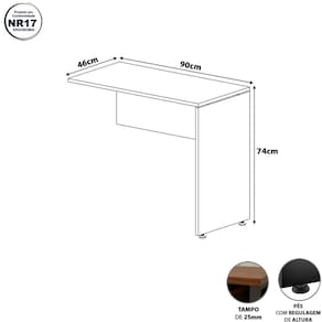 A Mesa Tampo Auxiliar 90cm x 46cm amplia o espaço de trabalho com praticidade e estilo. Ideal para escritórios e home offices, serve como apoio para documentos, equipamentos ou materiais de uso diário. Possui estrutura resistente com tampo e pé em painel de alta durabilidade, combinando perfeitamente com as mesas e móveis da linha Corporate.