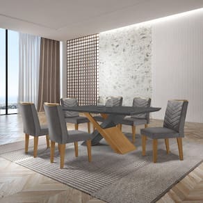 Produzida em material 100% MDF e tampo em MDF chanfrado. Em sua confecção é utilizada a pintura UV com acabamento em semi-brilho, que preservam a cor por mais tempo. As cadeiras são revestidas com tecidos de alta qualidade, e estofadas com espuma. Medida da Mesa (A x L x P): 79,6 cm X 180 cm X 90 cm Peso da Mesa: 65,4 kg Mesa suporta até: 30 kg Acabamento da Cadeira/Banco: Pintura UV Acabamento da Mesa: Pintura UV Acompanha Manual de Instalação: Sim Almofada do assento: Fixa Altura do Conjunto: 99,5 cm Ambiente Principal: Sala de Jantar Cadeira/Banco estofada: Encosto e Assento Estofados Cadeira/Banco suporta até: 100 kg Complexidade da Montagem: Média: pode ser montado por mais de uma pessoa e/ou necessite de maior conhecimento para montagem Cor: Grafite/Imbuia Cor da Base: Marrom Cor do Produto: Grafite/Imbuia Cor do Tampo: Grafite Cor Flex: Não Cor Secundária: Preto De Canto (Canto Alemão): Não Design da Base: Em X Enchimento do Assento: Espuma D-16 Enchimento do Encosto: Espuma D-14 Escala de Brilho: Semi-Brilho Espessura do Tampo: 15 mm Estrutura do Assento: MDF - 9 mm Estrutura do Encosto: MDF - 2,5 mm Formato do Tampo: Retangular Informações Complementares: Tampo chanfrado Itens Inclusos: 1 mesa, 6 cadeiras e 1 manual de montagem Linha ou Coleção: Imperatriz - Londrina Manual de Montagem e Instalação: https://product-hub-prd.madeiramadeira.com.br/900315/documents/a74b5966-8ef2-4bb5-bda6-98daffc944051868598mesaimperatriz.pdf Material da Base da Mesa: MDF Material da Estrutura da Cadeira: MDF Material do Tampo: MDF Material Principal: MDF Material Principal das Cadeiras/Bancos: MDF Medida da Cadeira/Banco (A x L x P): 99,5 cm X 42 cm X 61 cm Medida do Tampo (L x C x E): 90 cm X 180 cm X 15 cm Mesa Dobrável: Não Mesa Extensível: Não Montagem Flex: Não Necessita Montagem: Sim Origem do Produto: Nacional Peso da Cadeira/Banco: 8,125 kg Possui Apoio para Braços: Não Possui Apoio Para os Pés: Não Possui Rodízio: Não Possui Suporte Giratório: Não Possui Vidro: Não Quantidade de Cadeiras: 06 Quantidade de Lugares: 06 Recomendações de Uso, Manutenção e Limpeza: Limpar com pano seco Revestimento da Cadeira/Banco: Veludo Sistema de Montagem: Parafusos Tipo de Assento: Fixo Tipo de Encosto: Fixo
