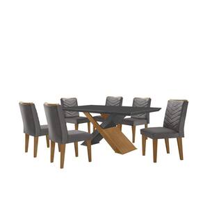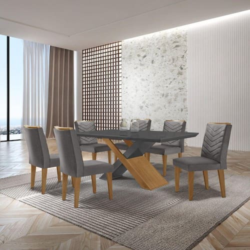 Mesa de Jantar Valentina é ideal para um ambiente aconchegante e moderno. O seu tampo amplo com detalhe chanfrado e sua base com design moderno, trazem um charme à parte ao ambiente. Suas cadeiras Monique são estofadas com espumas de alta qualidade, além de serem revestidas em tecido que oferece maior suavidade, maciez e beleza. Seu encosto possui um bordado em sua parte frontal e alça em MDF, trazendo modernidade e elegância para a sua casa. Perfeita para receber aquele grupo de amigos em casa e proporcionar momentos especiais.
