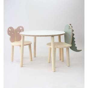 Kit composto de uma mesa redonda, tampo no mdf branco e altura de 45 cm. Duas cadeiras, sendo uma borboleta e outra dinossauro. Assentos na madeira. Pés em madeira, com 25 cm de altura. Encostos no mdf. Homologação Inmetro: CE-BRI/IQB 005608 54346/21-014 Marca: Store Kids