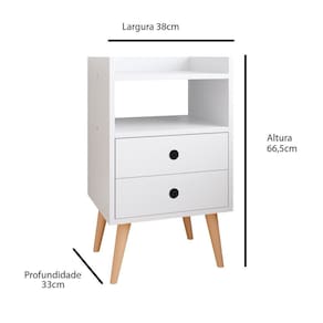 Conta com duas amplas gavetas que irão lhe auxiliar a deixar tudo em seu devido lugar. Também possui nicho e um amplo tampo, perfeitos para acomodar itens de uso diário e decorativos, como: Porta-retratos, livros, celulares, entre outros.