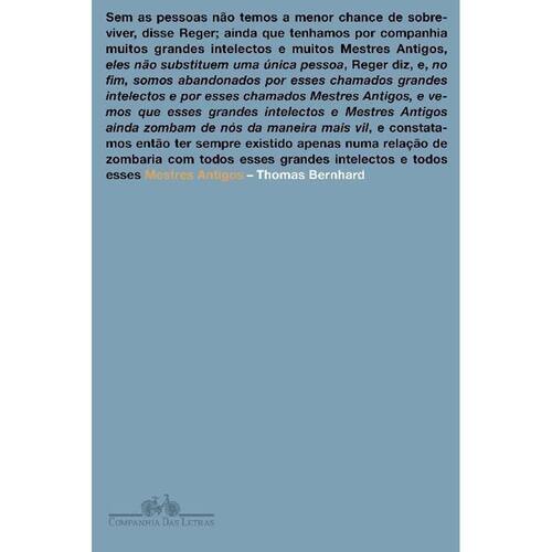 Bernhard faz um retrato cômico e implacável do meio artístico e da cultura austríaca por meio das conversas entre dois velhos amigos diante de uma pintura de Tintoretto. Por mais de trinta anos, Reger, um crítico musical octogenário, sentou-se no mesmo banco diante da pintura Homem de barba branca, de Tintoretto, no Museu de História da Arte de Viena. Ali ele reflete, dia sim, dia não, sobre a sociedade contemporânea, seus pares, a arte e os artistas, o clima e até o estado dos banheiros públicos. O amigo Atzbacher, um filósofo bem mais jovem, é convocado a encontrá-lo no museu num sábado, dia sempre evitado pelo crítico. E é através do seu olhar que passamos a conhecer mais sobre Reger — a morte trágica de sua mulher, seus temidos pensamentos suicidas, a relação difícil com seu país e, por fim, qual o verdadeiro propósito daquele encontro. Tão pessimista como exuberante, rancoroso e ao mesmo tempo hilário — no melhor estilo de Thomas Bernhard —, o romance é composto de um único parágrafo que se estende por 182 páginas e remonta uma série de conversas entre os dois amigos. Mestres A ntigos foi publicado originalmente em 1985 e é um retrato satírico da cultura e da nação austríaca, discutindo questões como genialidade, classe e as aspirações da humanidade. “O romance mais saboroso de Bernhard.” — Robert Craft, New York Review of Books “Bernhard é um dos mestres da ficção europeia contemporânea.” — George Steiner