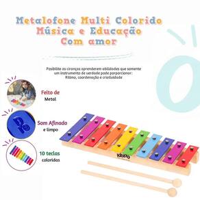 Metalofone infantil kidzzo colorido com 10 teclas em alumínio com afinação em c e e, diatônico; 01 par de baquetas.