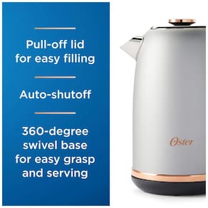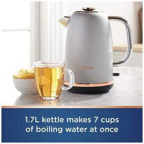 Chaleira elétrica Oster Metropolitan com capacidade de 1.7L, detalhes em ouro rosa, base giratória 360°, desligamento automático, proteção contra fervura a seco e janela para nível de água.Características