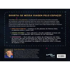 Bem-vindo, pequeno astrônomo! Vamos começar uma aventura! O que será que existe depois deste imenso céu azul? Um sol quente e brilhante? Pequenos planetas cobertos de gelo? Uma infinidade de luas girando sem parar? Está na hora de descobrirmos explorando o Sistema Solar! Fotos incríveis vão nos levar ao espaço e em cada planeta sem precisar de um telescópio! Conheceremos o nome de cada um dos oito planetas do Sistema Solar e descobriremos os planetas-anões Ceres, Plutão, Eris, Haumea e Makemake. Vamos rir juntos com fatos divertidos sobre o espaço: você sabia que as bolhas de refrigerante são feitas do mesmo gás que encontramos em Vênus? Nunca é cedo demais para pensar longe e fazer perguntas. Vamos espiar o espaço juntos? Marca: CAMINHO SUAVE*