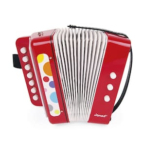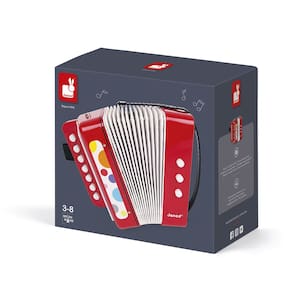 O acordeão possui 7 teclas para notas musicais, 2 teclas para mudanças de tom e 1 tecla para soprar o ar, tudo pensado para estimular a coordenação motora, concentração e percepção auditiva da criança.