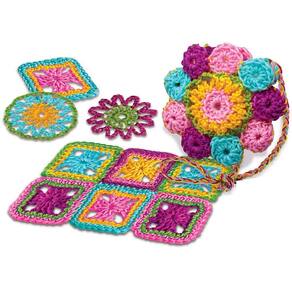 COMPOSIÇÃO: 02 agulhas de crochê 01 agulha de plástico Meadas de lãs coloridas 01 livreto de instruções detalhadas - Ilustrações para usuários destros e canhotos Conteúdo suficiente para fazer uma mini bolsa, um tapetinho colorido e alguns porta copos - Necessária a assistência e supervisão de um adulto