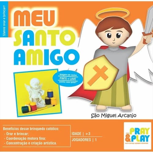 FAIXA ETÁRIA Pré-escolares de 3 a 6 anos até adolescentes QUANTIDADE DE JOGADORES 1 PREMISSAS Orar, brincar e aprender: SIM Conteúdo Católico Apostólico Romano: SIM Da nossa família para sua família: SIM Embalagem e materiais ecológicos e sustentáveis: SIM Faça você mesmo: SIM IDIOMA Português (Brasil) PROPÓSITO Apresentar às crianças as principais devoções de Nossa Senhora e dos Santos e Santas da nossa Igreja, despertando a curiosidade e criando identificação, devoção e amor pela história de cada um. A coleção MEU SANTO AMIGO da PRAY PLAY apresenta as principais devoções de Nossa Senhora e dos Santos e Santas da nossa Igreja, permitindo que a própria criança crie e pinte o seu próprio Santo Amigo! Na coleção MEU SANTO AMIGO da PRAY PLAY, a imagem é de resina, e os principais benefícios são: detalhes perfeitos e resistência superior em comparação com as imagens de gesso. E mais: basta lavar com água e pintar novamente a imagem, quantas vezes quiser! CONTEÚDO É composto por 1 imagem em resina branca modelo baby com altura aproximada de 12cm (pode variar conforme a devoção), conjunto com 6 tintas tipo guache, 1 pincel e 1 cartão com informações e curiosidades sobre a devoção. Marca: Pray E Play