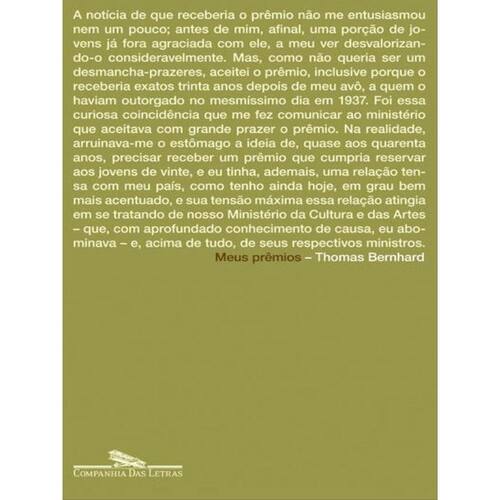 Não foram muitos: nove, no total, desde Frost, o romance de estreia (1963), ainda inédito no Brasil, a Extinção, de 1986. E um deles é considerado o maior prêmio literário da Alemanha: o Büchner. Alguns, pelo menos, foram dotados de uma soma - decerto bem-vinda, ainda que insuficiente - em dinheiro. Mas estamos falando de Thomas Bernhard. E o que ele tem a dizer sobre prêmios literários, em especial sobre aqueles que lhe foram outorgados ao longo da carreira, nem sempre é muito lisonjeiro. Meus prêmios, obra que Bernhard preparava para publicação pouco antes de morrer, em 1989, reúne nove relatos, três discursos e a carta em que o autor explica seu desligamento da ilustre Academia de Língua e Literatura de Darmstadt, a instituição que concede o cobiçado prêmio Büchner. No livro, Bernhard relata a rotina muitas vezes hilária da concessão e da outorga de prêmios literários, muitos dos quais o escritor foi receber em companhia da tia septuagenária. Ainda que não se trate de obra de ficção, a escrita de Meus prêmios revela o Bernhard afiado de sempre, revisitando aqui e ali algumas das passagens mais brilhantes de sua obra ficcional, como O sobrinho de Wittgenstein (Rocco, 1992), ou autobiográfica, como Origem.
