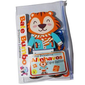 O objetivo desse alinhavo de madeira é passar o cadarço pelos furos, costurando as peças na base do tigre e montando diferentes e divertidos vestuários. Assim a criança aprende brincando