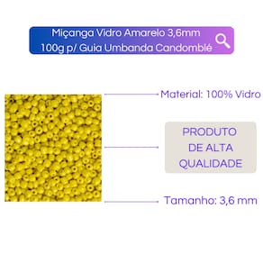 O Miçanga Vidro Amarelo 3,6mm da Bialluz, é ideal para criar guias de umbanda e candomblé que emanam paixão e energia,cada uma com 3,6 milímetros de beleza única.Essas miçangas de alta qualidade são a escolha perfeita para elevar suas práticas espirituais.