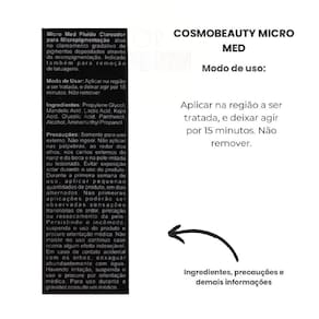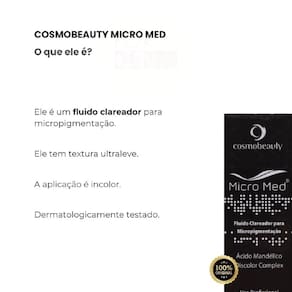 Descrição do ProdutoO Micro Med Fluido é um cosmético desenvolvido para cuidados diários da pele, com fórmula que combina ativos esfoliantes e hidratantes. Sua textura leve proporciona sensação de suavidade, ajudando a manter a pele com aspecto uniforme e renovado.Benefícios e característicasSensação de renovação da pele, textura confortável, toque seco e rápida absorção, indicado para uso pontualAtivos presentesMandélico e Discolor ComplexModo de usoAplicar na região desejada com a pele limpa e seca. Não remover.