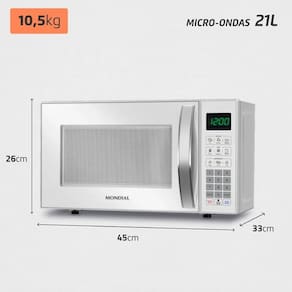 - Capacidade: 21L - ideal para famílias ou quem prepara refeições completas. - Potência: 1.200W - aquece, descongela e cozinha com rapidez. - Funções especiais: * Menu Dia a Dia: 6 opções pré-ajustadas (ex.: leite, pizza, sopa). * Menu Kids: Receitas divertidas (pipoca, bolo de caneca, brigadeiro). * Descongelamento automático: Por peso ou tempo. * Manter aquecido: Preserva a temperatura dos alimentos. * Tira-odor: Elimina odores residual. - Segurança: Trava infantil e prato giratório de vidro resistente. - Display digital: Facilita o ajuste de tempo e potência (10 níveis).