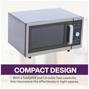 CONTROLE DE COZIMENTO SEM ESFORÇO Ajuste facilmente os tempos de cozimento com o intuitivo controle de discagem, com opções de temporização variando de 10 a 50 segundos em intervalos de 10 segundos, incrementos de 30 segundos de até 3 minutos, e intervalos de 1 minuto de até oito minutos. DURABILIDADE DE QUALIDADE COMERCIAL Construído com um interior e exterior de aço inoxidável, este micro-ondas foi projetado para resistir às exigências do uso comercial, sendo perfeito para lojas de conveniência, salas de descanso de escritórios, restaurantes de serviço rápido e muito mais. DESIGN COMPACTO Com uma pegada compacta e capacidade interna,este micro-ondas cabe facilmente em balcões ou em espaços apertados, sendo ideal para diversos estabelecimentos de serviços de alimentação e instalações. APLICAÇÕES VERSÁTEIS Desde aquecer sopas e sanduíches até preparar pizzas e casseroles, este micro-ondas oferece uma solução conveniente para uma ampla gama de alimentos, tornando-o indispensável para cozinhas movimentadas e preparação de alimentos em movimento. CARACTERÍSTICAS CONVENIENTES Equipado com uma alça grande e fácil de segurar e uma janela de vidro transparente, este micro-ondas facilita a retirada de alimentos e a monitorização do processo de cozimento, melhorando a conveniência e eficiência do usuário.