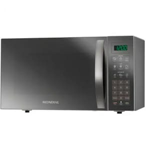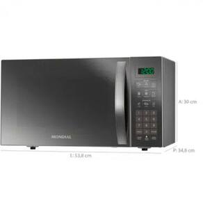 Características: Marca: Mondial Modelo: MO-02-34-E Tipo: Micro-ondas de bancada Capacidade: 34 litros Níveis de potência: 10 níveis Timer: Sim Display: Sim Relógio: Sim Luz interna: Sim Prato giratório: Sim Menu de receitas: Sim Tecla descongelar: Sim Desodorizador: Sim Funções: Tira odor, descongelar, manter aquecido, menu dia a dia/menu kids e função relógio Potência: 1400 W Consumo: 1,4Kw/h
