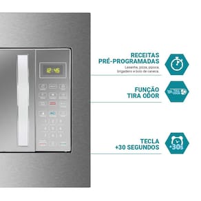 Micro-ondas de embutir, 28L de capacidade total (14L útil), 1400W de potência, Prato giratório de 28,5 cm, Pintura interna Limpa Fácil, Display digital, Função Descongelar por tempo ou peso, Função +30 segundos, Função Cozinhar por tempo ou peso, Função Manter Aquecido, Função Tira Odor, Função Travar, Receitas pré-programadas (Lasanha, Menu Fit, Pizza, Pipoca, Brigadeiro, Bolo de Caneca).Função Grill