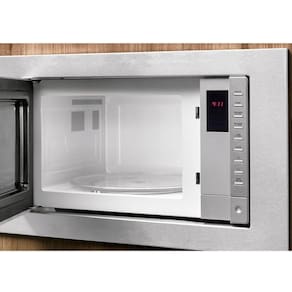 Design de embutir com acabamento em inox | Funções automáticas e descongelamento | Painel eletrônico digital | 5 níveis de potência | Prato giratório | Luz interna | Trava de segurançaFunção Grill