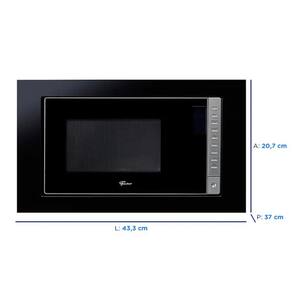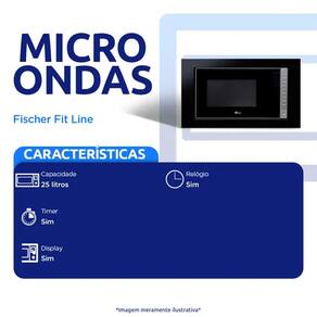 Características: Marca: Fischer Modelo: Fit Line Tipo: Micro-ondas de embutir Capacidade: 25 litros Diâmetro do prato de vidro: 315 mm Lâmpada: 1x25 W Display: Sim Relógio: Sim Prato giratório: Sim Potência: 900W Frequência: 60 Hz Consumo Energético: 1,45 kWh Inmetro: Sim Tipo de plugue: Padrão ABNT -3pinos- Comprimento do cabo de alimentação: 1 metro Funções: Descongelamento por Tempo, Descongelamento por Peso, Automenu com 8 Opções, Relógio 24h e Trava de Segurança. 5 níveis de potência Display digital Controle eletrônico digital Moldura com saída de ar integrada Sistema de ventilação interna parares friamento dos componentes