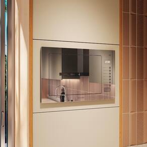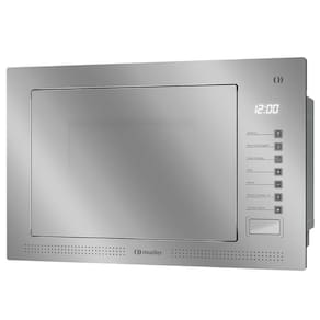 Micro-ondas de Embutir Mueller 25 L Espelhado (MME25K): acabamento sofisticado com vidro espelhado + inox, capacidade de 25 litros, potência total de 1450 W, painel digital touch com 5 níveis, função descongelar por tempo ou peso, timer com aviso sonoro, luz interna. Elegância e praticidade para sua cozinha planejada.