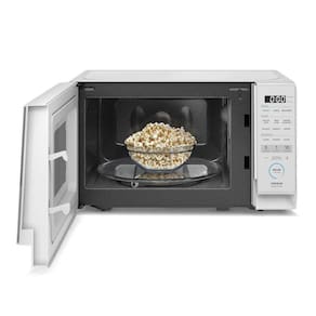 O microondas tambem conta com 3 receitas pre programadas (pipoca, arroz e brigadeiro) e 10 niveis de potencia que permitem ajustar o preparo conforme o tipo de alimento, enquanto a funcao descongelar por tempo para carne, frango e feijao, garante eficiencia sem riscos de cozimento parcial.