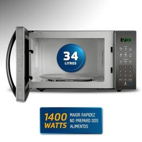 Micro-ondas com 34 litros de capacidade interna e 1400W de potência. Possui 10 níveis de potência, função descongelar, função manter aquecido, função tira odor e função kids. Inclui prato giratório de vidro e suporte.Função Grill