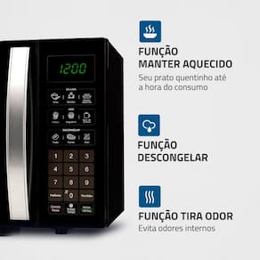 Micro-ondas Mondial 34 litros, 1400W de potência, funções Menu Dia a Dia e Menu Kids, função descongelar, função manter aquecido, 10 níveis de potência, função tira odor, trava de segurança e selo de eficiência energética A.Função Grill