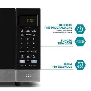 Tecnologia Flat (sem prato giratório), Pintura Limpa Fácil interna, Display digital com relógio, Funções: manter aquecido, tira odor, +30s, travar, desligar som/display, Receitas pré-programadas: pipoca, brigadeiro, pizza, lasanha, bolo de caneca, menu fit.Função Grill