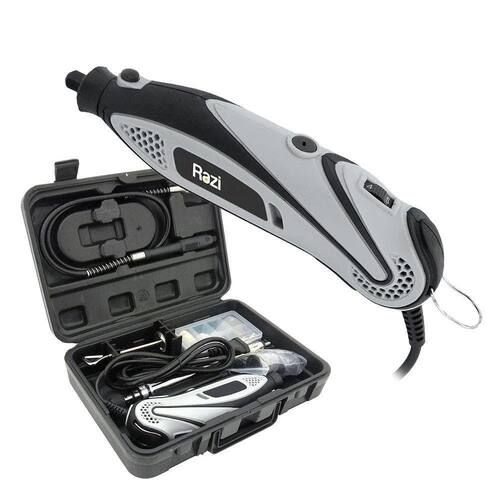 - Marca: Razi - Modelo: RZ-MR130 - Potência: 130W - Velocidade variável - Rotações: 10.000 a 32.000 RPM - Diâmetro Máximo da pinça: 3,2mm - Dupla Isolação - Acompanha eixo flexível (chicote) suporte de bancada, maleta e mais 193 acessórios - Dimensões da embalagem: 214 x 88 x 309mm - Peso bruto: 1,8Kg - Garantia: 90 dias