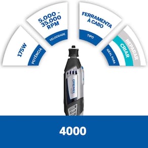A Micro Retífica 4000 Com Maleta Metálica - Dremel, é a escolha ideal para quem busca máxima precisão e praticidade, seja para artesãos, instaladores ou profissionais em geral. Com mais de 8 funções distintas em uma única ferramenta, ela garante desempenho superior e resultados perfeitos, tornando-se indispensável em projetos detalhados. Para profissionais, ela se destaca como um complemento essencial para a caixa de ferramentas, sendo um verdadeiro coringa para lidar com trabalhos imprevistos. Além disso, a Micro Retífica 4000 vem acompanhada de uma maleta metálica resistente, que proporciona organização, segurança e praticidade no armazenamento da ferramenta e seus acessórios. Características: Ideal para gravar, cortar, esculpir, polir, lixar, limpar, esmerilhar, afiar e perfurar. Trabalhe com madeira, metal, plástico, couro, EVA, papelão, cerâmica, pedra e vidro. liga/desliga e botão para ajuste de velocidade. Constância Eletrônica: Mantém a potência por todo o uso. Descrição do Produto: Voltagem V : 127V. Fonte de Energia: Cabo. Potência W : 175. Velocidade Variável RPM : 5.000 - 35.000. Uso Indicado: Madeira, metal, plástico, couro, EVA, papelão, cerâmica, pedra e vidro. Acompanha na Embalagem: 01 Micro Retífica 4000. 01 Manual de Instruções. 01 Maleta Metálica. Referência: 4000. Cód. De Fábrica: 0615A002JY000. Marca: Bosch.