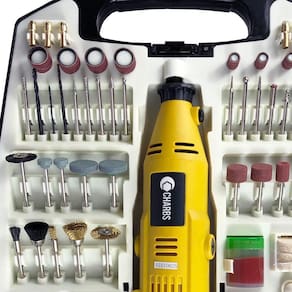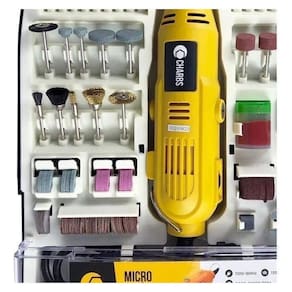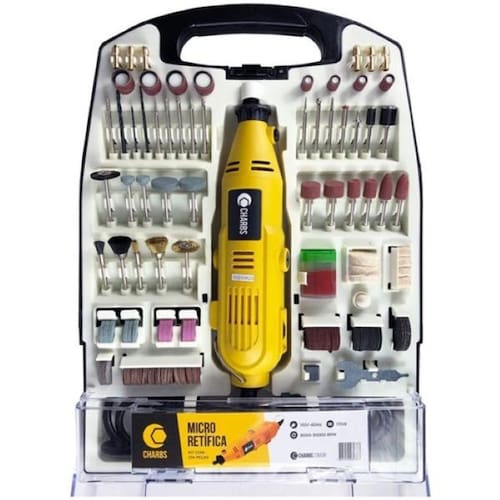 Micro Retífica com 234 Acessórios e Maleta CH2904-X Charbs - 110V Mini Retífica Charbs é a ferramenta ideal para trabalhos de desbaste, remoção, limpeza, polimento, gravação, lixamento e furação de diferentes tipos de materiais e superfícies. Tenha em mãos um kit que reúne tudo o que você precisa em uma exclusiva maleta portátil para você levar onde for - Marca: Charbs - Modelo: CH2904x - Potência: 135W - Voltagem: 127V - Frequência: 60 Hz - 6 Velocidades - Velocidade Variável entre 8.000 e 30.000 Rpm - Acompanha maleta e 234 acessórios - Isolação Dupla - Peso bruto: 1,53Kg - Garantia: 90 dias Itens inclusos: - 1 Micro Retífica Charbs - 6 Pinças - 8 Tubos de Lixa - 3 Brocas - 9 Pontas diamantadas - 2 Suporte para discos de corte - 1 Suporte para disco de polimento - 2 Suportes para tubos de lixa - 3 Escovas de nylon - 3 Escovas de metal - 10 Pontas montadas - 1 Frasco com paste de polimento - 7 Discos de polir - 14 Discos de desbastar - 90 Discos de lixa - 65 Discos de corte - 5 Discos de corte reforçados - 1 Pedra de amolar - 1 Chave de troca - 1 Ponta para polir Ean: 7895099089387