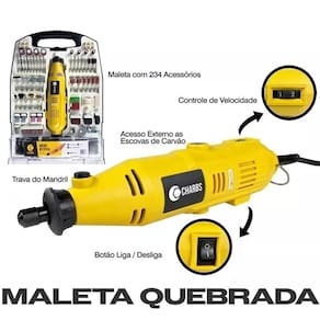 - marca: charbs - modelo: ch2904x - potência: 135w - frequência: 60 hz - 6 velocidades - velocidade variável entre 8.000 e 30.000 rpm - acompanha maleta e 234 acessórios - isolação dupla - peso bruto: 1,53kg - garantia: 90 dias