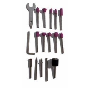 Modo de usar: Sua ferramenta rotativa foi projetada para furar, cortar, lixar, retificar, fresar e polir madeira, metal, plástico e pedra. A ferramenta é projetada para trabalhos leves, como gravação, modelagem, hobby e etc. A ferramenta não deve ser usada para serviços pesados, caso contrário, pode ser danificada. Características: Potência de entrada: 130w Velocidade sem carga: 10.000-32.000 rpm Tamanho da pinça: 3,2 mm Controle de velocidade variável 52 acessórios 1 maleta plástica Voltagem: 110v