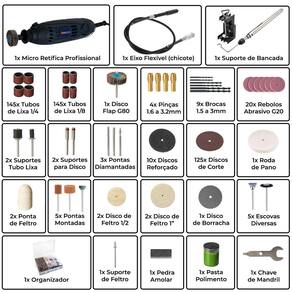 Micro retífica profissional 150w com chicote suporte e 500 acessórios dremax Você está cansado de ferramentas que não entregam o que prometem Precisa de precisão, potência e variedade para realizar trabalhos minuciosos em diferentes materiais A micro retífica dremax mr200 é a ferramenta ideal para quem exige mais da sua oficina, do hobby ou do trabalho profissional. Com 150w reais de potência e 500 acessórios inclusos, ela lixa, corta, grava, polimenta, perfura e muito mais com extrema qualidade e acabamento fino. Por que escolher a mr200 dremax - potente motor de 150w rms: performance de verdade sem quedas de rotação - 6 velocidades variáveis: controle total entre 8.000 a 30.000 rpm - eixo flexível chicote : leveza e precisão para detalhes finos - suporte de bancada incluso: liberdade para trabalhos fixos e contínuos - acompanha 500 acessórios: variedade para todas as tarefas madeira, metal, vidro, pedra, plástico, borracha, couro... - organizador incluso: mantenha os seus acessórios à mão e bem guardado - mandril com trava rápida e pinças ajustáveis : agilidade e adaptação para diversas hastes Inúmeras aplicações: - corte de precisão em metais e plásticos - gravações artísticas em madeira e vidro - polimento e acabamento em joias - lixamento detalhado de cantos e curvas - restauração de objetos delicados - modelismo, artesanato, bijuteria e marcenaria ou hobby A dremax atende ambos Não importa se você é um artesão, ourives, marceneiro ou apenas apaixonado por criar: a dremax mr200 é a solução versátil que resolve as frustrações de quem precisa de acabamento perfeito sem esforço. Itens inclusos - 1 micro retífica dremax - 1 eixo flexível chicote - 1 suporte de bancada - 145 tubos de lixa 12,7mm 1/4 pol. grão 60 - 145 tubos de lixa 6,4mm 1/8 pol. grão 60 - 4 pinças 1.6, 2.4, 3.0 e 3.2mm - 9 brocas 1.5mm 3x 2.4mm 4x 3mm 2x - 10 discos de corte 32mm reforçados - 125 discos de corte 22mm - 20 rebolo abrasivo 20mm grão 220 - 1 disco de borracha para polir 20mm - 2 pontas montadas carboneto de silício verde - 3 pontas montadas óxido de alumínio laranja - 2 discos de feltro 25,4mm - 2 discos de feltro 12,7mm - 2 pontas de feltro 10mm - 1 roda de pano com costura - 1 disco flap com haste grão 80 - 3 pontas diamantadas - 2 suporte para discos de corte - 1 suporte para disco de polimento - 1 suporte para tubos de lixa 1/4 - 1 suporte para tubos de lixa 1/8 - 2 escovas de nylon - 1 escova de metal - 2 escovas de latão - 1 frasco com pasta de polimento - 1 chave de mandril - 1 pedra de amolar - 1 organizador para acessórios - 1 caixa embalagem de papelão Um ou outro acessório pode variar de acordo com o lote Faq - dúvidas frequentes 1. Quais materiais posso trabalhar com a mr200 Madeira, metais, mdf, plástico, vidro, borracha, couro, porcelanato, aço inox, gesso, cerâmica, granito, mármore e muito mais. 2. A micro retífica é bivolt Não, verifique a voltagem disponível no anúncio 110v ou 220v, conforme o modelo disponível . 3. O eixo flexível é removível Sim você pode usar com ou sem o eixo flexível. Basta conectar ou remover conforme a necessidade do trabalho. 4. Posso usar acessórios de outras marcas Sim a dremax é compatível com acessórios padrão universal diâmetros de 1.6mm a 3.2mm . É indicada para uso contínuo Sim o motor de 150w permite uso prolongado com segurança, mas recomendamos pausas periódicas em uso contínuo de alta rotação.