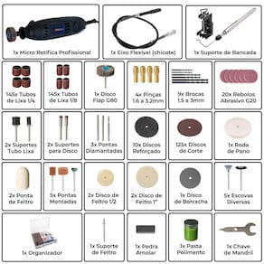 Micro retífica profissional 150w com chicote suporte e 500 acessórios dremax Você está cansado de ferramentas que não entregam o que prometem Precisa de precisão, potência e variedade para realizar trabalhos minuciosos em diferentes materiais A micro retífica dremax mr200 é a ferramenta ideal para quem exige mais da sua oficina, do hobby ou do trabalho profissional. Com 150w reais de potência e 500 acessórios inclusos, ela lixa, corta, grava, polimenta, perfura e muito mais com extrema qualidade e acabamento fino. Por que escolher a mr200 dremax - potente motor de 150w rms: performance de verdade sem quedas de rotação - 6 velocidades variáveis: controle total entre 8.000 a 30.000 rpm - eixo flexível chicote : leveza e precisão para detalhes finos - suporte de bancada incluso: liberdade para trabalhos fixos e contínuos - acompanha 500 acessórios: variedade para todas as tarefas madeira, metal, vidro, pedra, plástico, borracha, couro... - organizador incluso: mantenha os seus acessórios à mão e bem guardado - mandril com trava rápida e pinças ajustáveis : agilidade e adaptação para diversas hastes Inúmeras aplicações: - corte de precisão em metais e plásticos - gravações artísticas em madeira e vidro - polimento e acabamento em joias - lixamento detalhado de cantos e curvas - restauração de objetos delicados - modelismo, artesanato, bijuteria e marcenaria ou hobby A dremax atende ambos Não importa se você é um artesão, ourives, marceneiro ou apenas apaixonado por criar: a dremax mr200 é a solução versátil que resolve as frustrações de quem precisa de acabamento perfeito sem esforço. Itens inclusos - 1 micro retífica dremax - 1 eixo flexível chicote - 1 suporte de bancada - 145 tubos de lixa 12,7mm 1/4 pol. grão 60 - 145 tubos de lixa 6,4mm 1/8 pol. grão 60 - 4 pinças 1.6, 2.4, 3.0 e 3.2mm - 9 brocas 1.5mm 3x 2.4mm 4x 3mm 2x - 10 discos de corte 32mm reforçados - 125 discos de corte 22mm - 20 rebolo abrasivo 20mm grão 220 - 1 disco de borracha para polir 20mm - 2 pontas montadas carboneto de silício verde - 3 pontas montadas óxido de alumínio laranja - 2 discos de feltro 25,4mm - 2 discos de feltro 12,7mm - 2 pontas de feltro 10mm - 1 roda de pano com costura - 1 disco flap com haste grão 80 - 3 pontas diamantadas - 2 suporte para discos de corte - 1 suporte para disco de polimento - 1 suporte para tubos de lixa 1/4 - 1 suporte para tubos de lixa 1/8 - 2 escovas de nylon - 1 escova de metal - 2 escovas de latão - 1 frasco com pasta de polimento - 1 chave de mandril - 1 pedra de amolar - 1 organizador para acessórios - 1 caixa embalagem de papelão Um ou outro acessório pode variar de acordo com o lote Faq - dúvidas frequentes 1. Quais materiais posso trabalhar com a mr200 Madeira, metais, mdf, plástico, vidro, borracha, couro, porcelanato, aço inox, gesso, cerâmica, granito, mármore e muito mais. 2. A micro retífica é bivolt Não, verifique a voltagem disponível no anúncio 110v ou 220v, conforme o modelo disponível . 3. O eixo flexível é removível Sim você pode usar com ou sem o eixo flexível. Basta conectar ou remover conforme a necessidade do trabalho. 4. Posso usar acessórios de outras marcas Sim a dremax é compatível com acessórios padrão universal diâmetros de 1.6mm a 3.2mm . É indicada para uso contínuo Sim o motor de 150w permite uso prolongado com segurança, mas recomendamos pausas periódicas em uso contínuo de alta rotação.