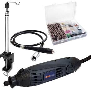 Micro retífica profissional 150w com chicote suporte e 500 acessórios dremax Você está cansado de ferramentas que não entregam o que prometem Precisa de precisão, potência e variedade para realizar trabalhos minuciosos em diferentes materiais A micro retífica dremax mr200 é a ferramenta ideal para quem exige mais da sua oficina, do hobby ou do trabalho profissional. Com 150w reais de potência e 500 acessórios inclusos, ela lixa, corta, grava, polimenta, perfura e muito mais com extrema qualidade e acabamento fino. Por que escolher a mr200 dremax - potente motor de 150w rms: performance de verdade sem quedas de rotação - 6 velocidades variáveis: controle total entre 8.000 a 30.000 rpm - eixo flexível chicote : leveza e precisão para detalhes finos - suporte de bancada incluso: liberdade para trabalhos fixos e contínuos - acompanha 500 acessórios: variedade para todas as tarefas madeira, metal, vidro, pedra, plástico, borracha, couro... - organizador incluso: mantenha os seus acessórios à mão e bem guardado - mandril com trava rápida e pinças ajustáveis : agilidade e adaptação para diversas hastes Inúmeras aplicações: - corte de precisão em metais e plásticos - gravações artísticas em madeira e vidro - polimento e acabamento em joias - lixamento detalhado de cantos e curvas - restauração de objetos delicados - modelismo, artesanato, bijuteria e marcenaria ou hobby A dremax atende ambos Não importa se você é um artesão, ourives, marceneiro ou apenas apaixonado por criar: a dremax mr200 é a solução versátil que resolve as frustrações de quem precisa de acabamento perfeito sem esforço. Itens inclusos - 1 micro retífica dremax - 1 eixo flexível chicote - 1 suporte de bancada - 145 tubos de lixa 12,7mm 1/4 pol. grão 60 - 145 tubos de lixa 6,4mm 1/8 pol. grão 60 - 4 pinças 1.6, 2.4, 3.0 e 3.2mm - 9 brocas 1.5mm 3x 2.4mm 4x 3mm 2x - 10 discos de corte 32mm reforçados - 125 discos de corte 22mm - 20 rebolo abrasivo 20mm grão 220 - 1 disco de borracha para polir 20mm - 2 pontas montadas carboneto de silício verde - 3 pontas montadas óxido de alumínio laranja - 2 discos de feltro 25,4mm - 2 discos de feltro 12,7mm - 2 pontas de feltro 10mm - 1 roda de pano com costura - 1 disco flap com haste grão 80 - 3 pontas diamantadas - 2 suporte para discos de corte - 1 suporte para disco de polimento - 1 suporte para tubos de lixa 1/4 - 1 suporte para tubos de lixa 1/8 - 2 escovas de nylon - 1 escova de metal - 2 escovas de latão - 1 frasco com pasta de polimento - 1 chave de mandril - 1 pedra de amolar - 1 organizador para acessórios - 1 caixa embalagem de papelão Um ou outro acessório pode variar de acordo com o lote Faq - dúvidas frequentes 1. Quais materiais posso trabalhar com a mr200 Madeira, metais, mdf, plástico, vidro, borracha, couro, porcelanato, aço inox, gesso, cerâmica, granito, mármore e muito mais. 2. A micro retífica é bivolt Não, verifique a voltagem disponível no anúncio 110v ou 220v, conforme o modelo disponível . 3. O eixo flexível é removível Sim você pode usar com ou sem o eixo flexível. Basta conectar ou remover conforme a necessidade do trabalho. 4. Posso usar acessórios de outras marcas Sim a dremax é compatível com acessórios padrão universal diâmetros de 1.6mm a 3.2mm . É indicada para uso contínuo Sim o motor de 150w permite uso prolongado com segurança, mas recomendamos pausas periódicas em uso contínuo de alta rotação.